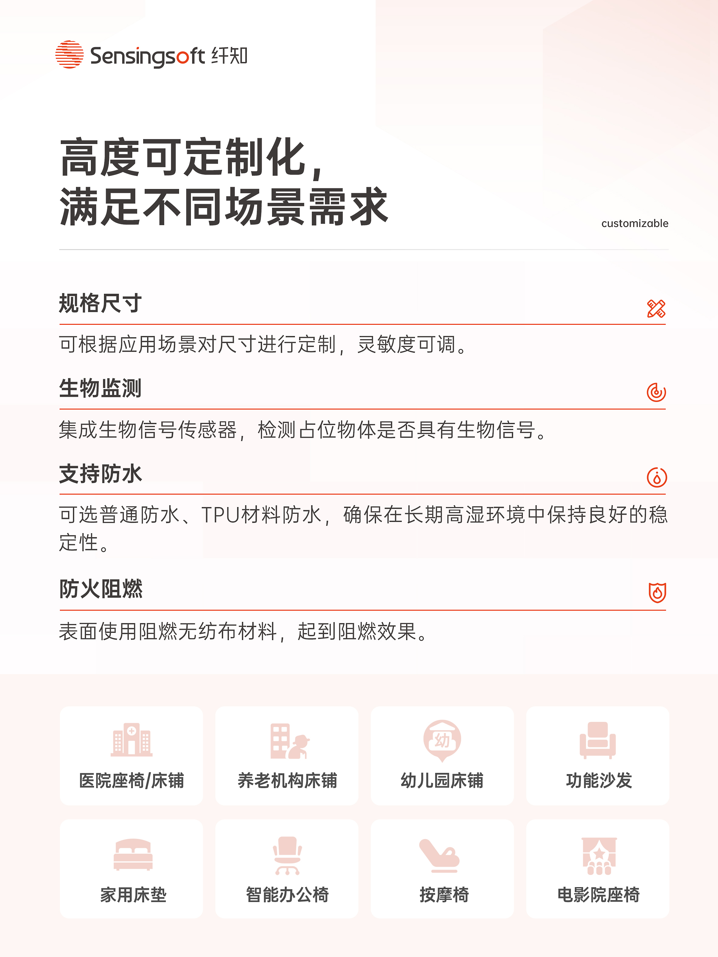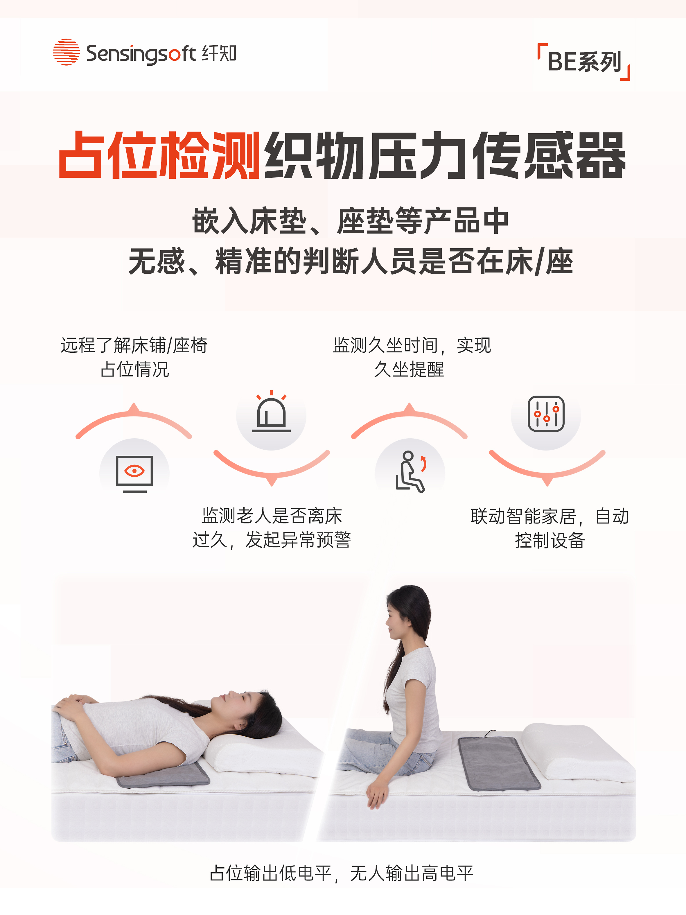 纤知智能(Sensingsoft)占位检测织物压力传感器可嵌入床垫、座垫中,无感、精准的判断人员是否在床/在座,能助力实现多项智能化功能: