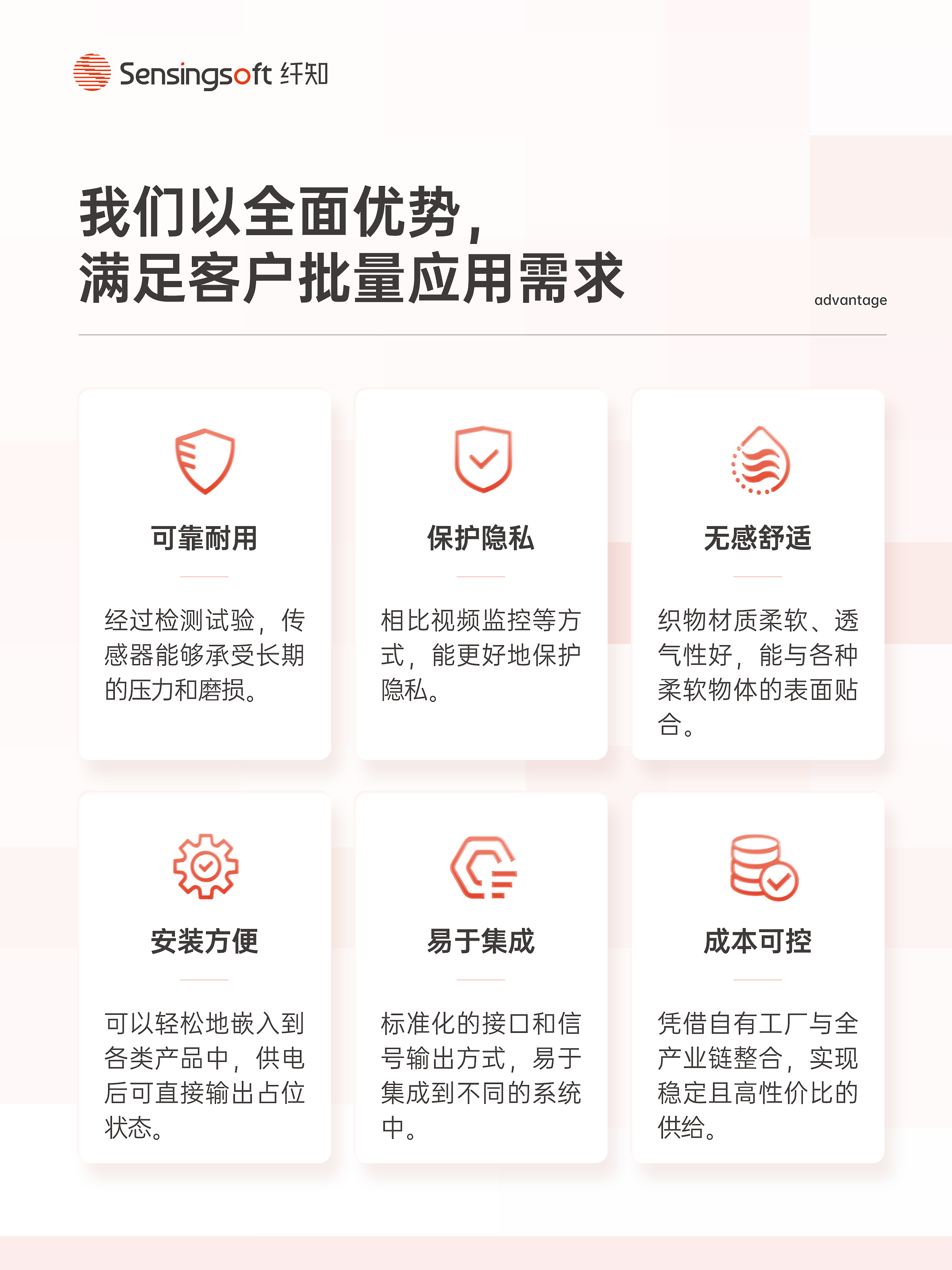 纤知智能(Sensingsoft)希望凭借可靠耐用、无感舒适、安装方便的产品特性,以及易于集成、成本可控、保护隐私的全面优势,满足客户对批量应用的要求。